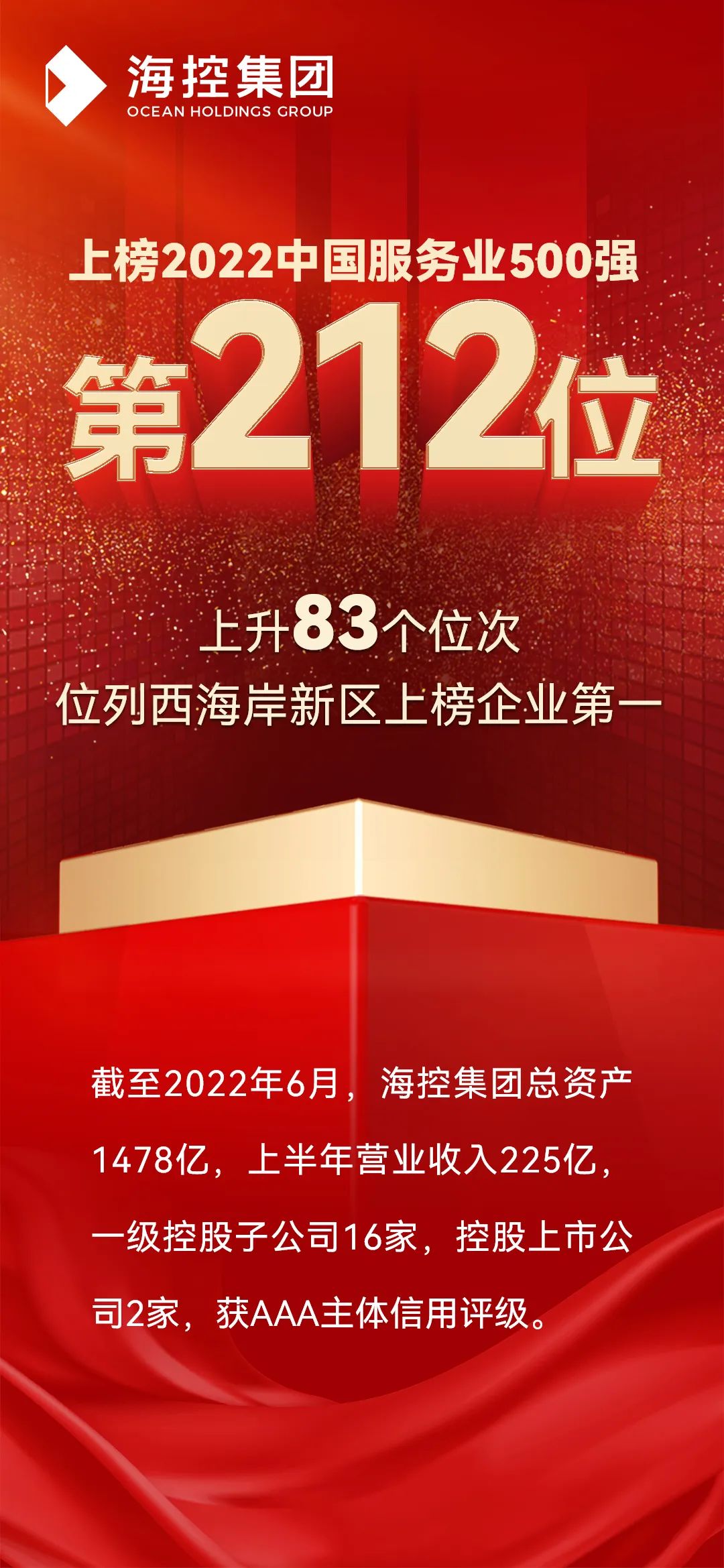 喜報 | 中國服務業500強發布,海控集團排名第212位,位列新區上榜企業第一 2022-09-07 17:44:35 9月6日,中國企業聯合會、中國企業家協會發布2022中國服務業企業500強榜單,海控集團位列第212位,比去年上升了83個位次,位列新區上榜企業第一。